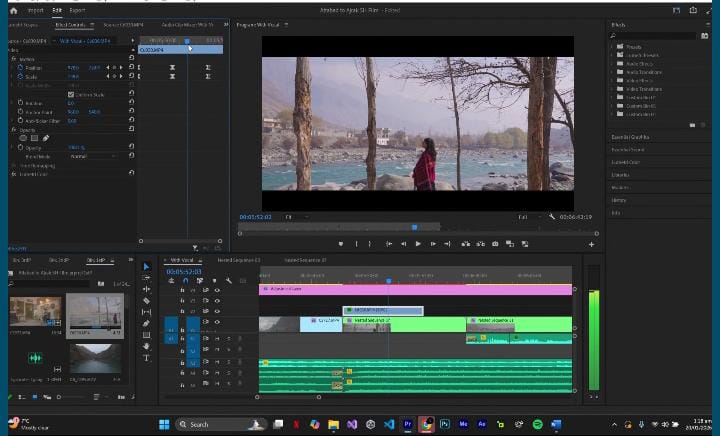 To create the setting and have a relaxed introduction, the first sequence was cut with more shot lengths. I also applied extensive shots and slow movement to capture the quietness of Attabad and bring the audience to the actual place. These shots were specifically located in front of no emotional or cultural scenes so that the audience would be able to relate to the space in the first place.